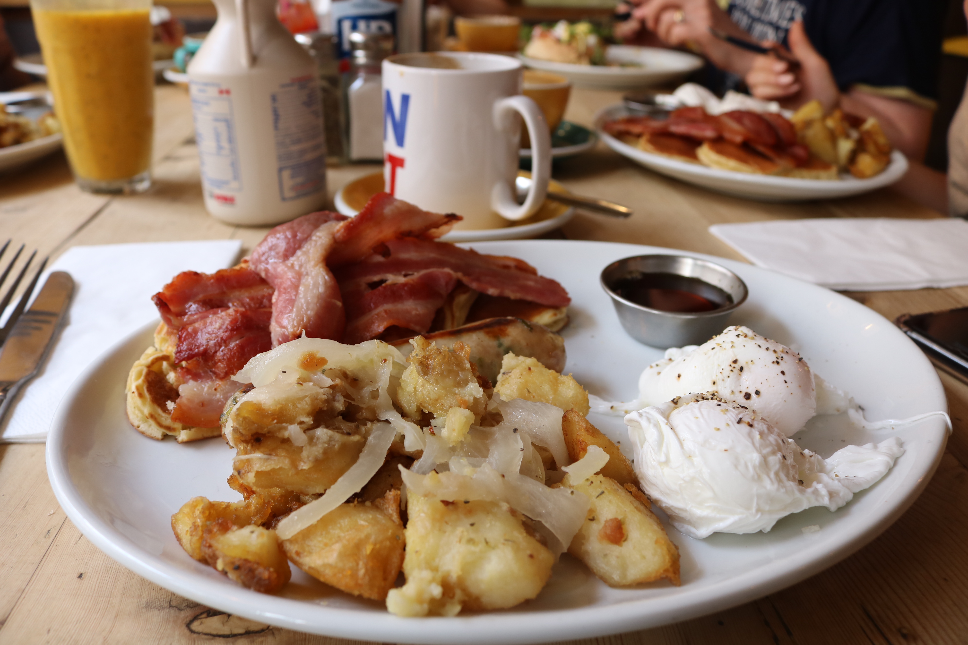 Duck and Waffle: Bishopsgate, London: Looking to impress, want to see the city from a different angle, looking for an experience? Be sure to pre-book (at least two weeks before you go if you want a dinner reservation) a table at Duck and Waffle! This skyline restaurant is located on the 40th floor of the Heron Tower building. From stepping into the glass elevator to walking into the restaurant you will understand why it is so popular. This restaurant stays open 365 days a year, 24-7!! Imagine… full dinner service at 4am haha! I booked us in for breakfast as this was the only slot available and we treated ourselves as it was my birthday. So, mimosa in hand, you can watch the 360 degree views of London, watch the hustle and bustle of how the kitchen operates with an open kitchen and sit back and relax. You are allowed to stay for 1 hour for breakfast which is plenty time. Menu does not have the widest range but it had something to suit us all and was delicious! Started with a small pastry platter and then had scrambled eggs with toast and bacon. It is more expensive but you are paying for the experience!
